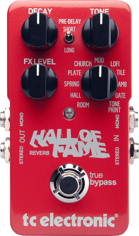 The Hall of Fame Reverb pedal has a really sleek all red classy look to it.